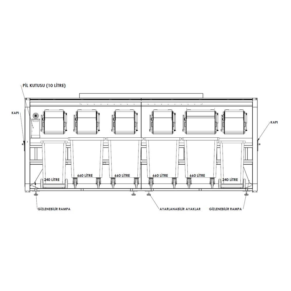8-Atık getirme merkezinin iç haznesinden konteynerlerin rahat boşaltılabilmesi için 2 yanında kilitlenebilir 955x1625mm ölçüsünde kapı olacaktır. İç konteynerlerin çıkarılmasını rahat şekilde yapılabilmesi için gizli rampa yapılacaktır.