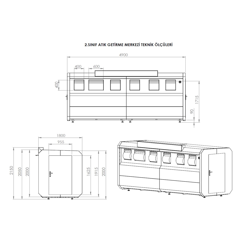1-2. Sınıf atık getirme merkezi ekteki teknik resme göre ön 4900x1800x2150mm ölçülerine göre imal edilecektir.